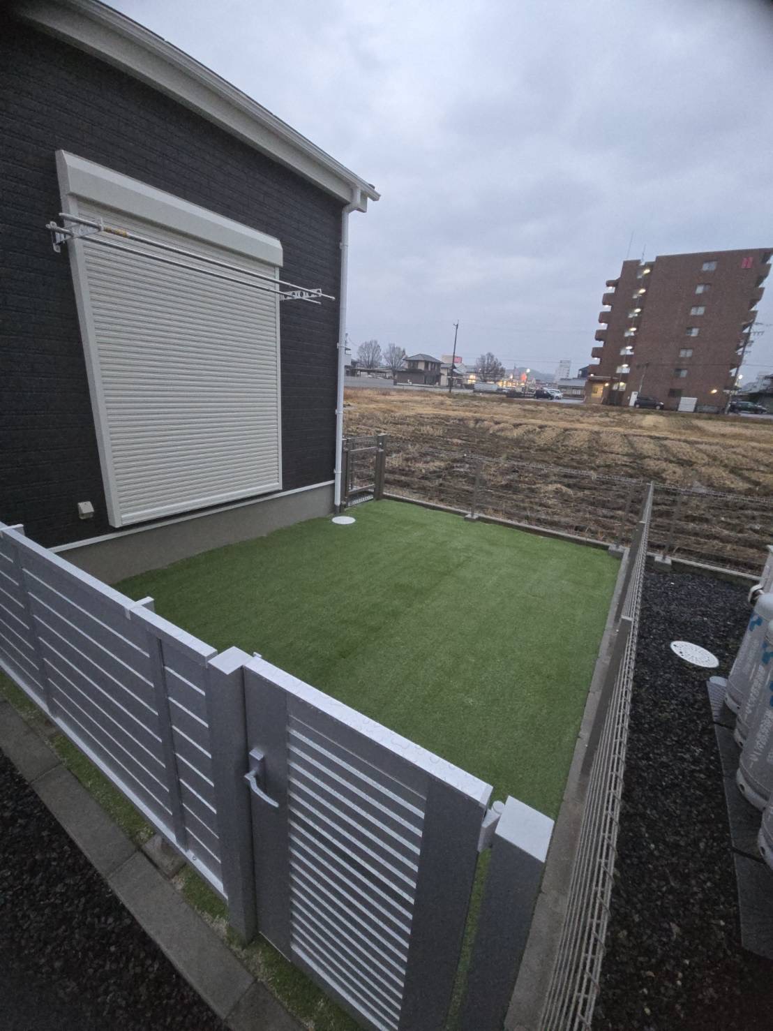 お庭部分には人工芝を施工し、年間を通して手入れの少ない、緑の映える空間に仕上げました。